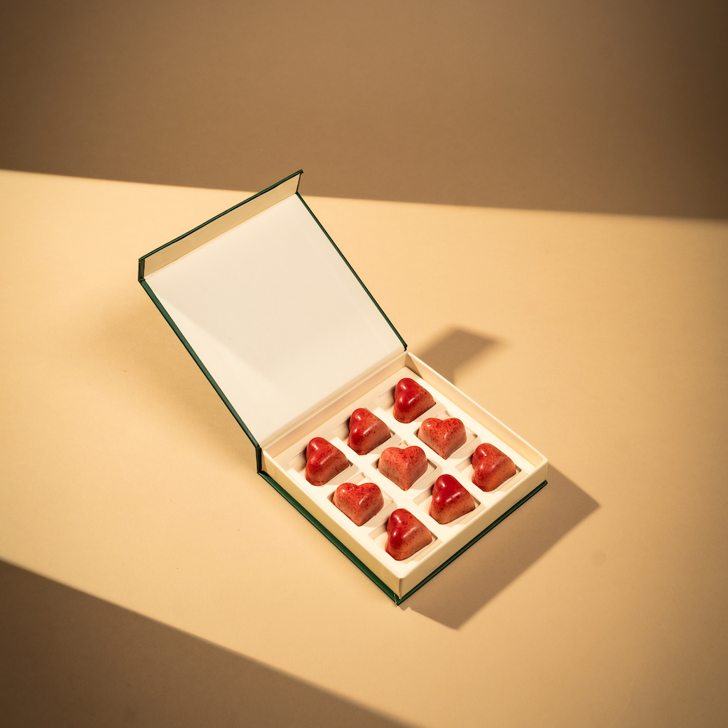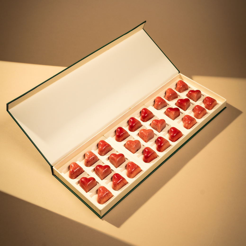 N’hésitez pas à nous appeler si vous souhaité d’autres types de cœurs dans votre coffret (matcha, praliné framboise, caramel framboise)