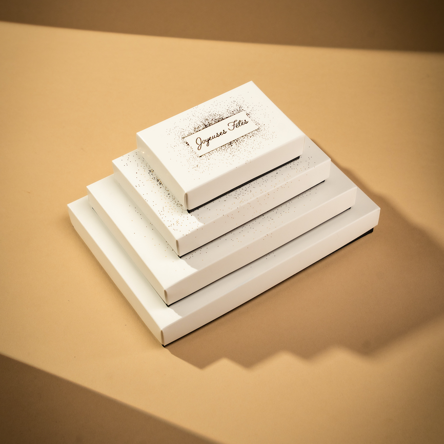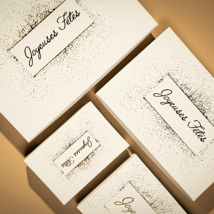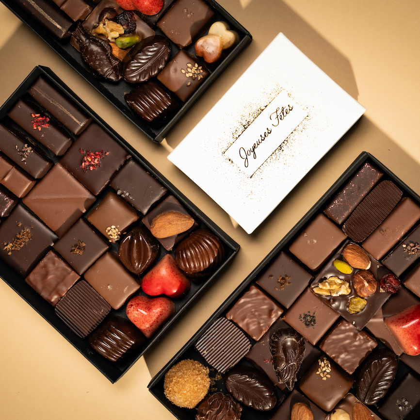 Coffret Joyeuses Fêtes garni d’un assortiment de chocolats gourmands et raffinés pour la fin d’année.