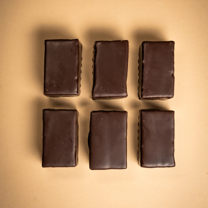 Guimauves moelleuses enrobées d’une fine couche de chocolat noir.