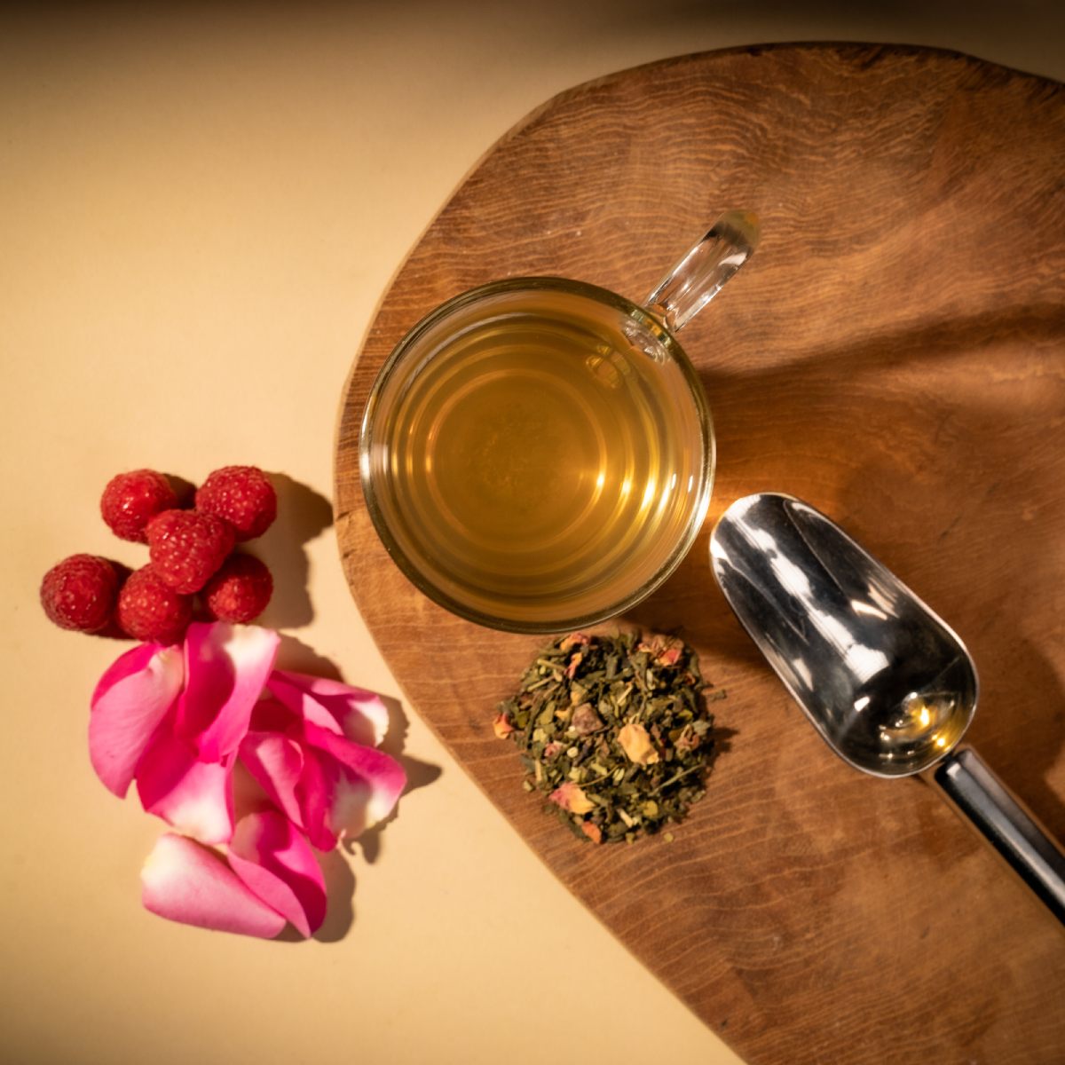 Thé vert à la rose et framboise aromatisé fruits rouges et citron.